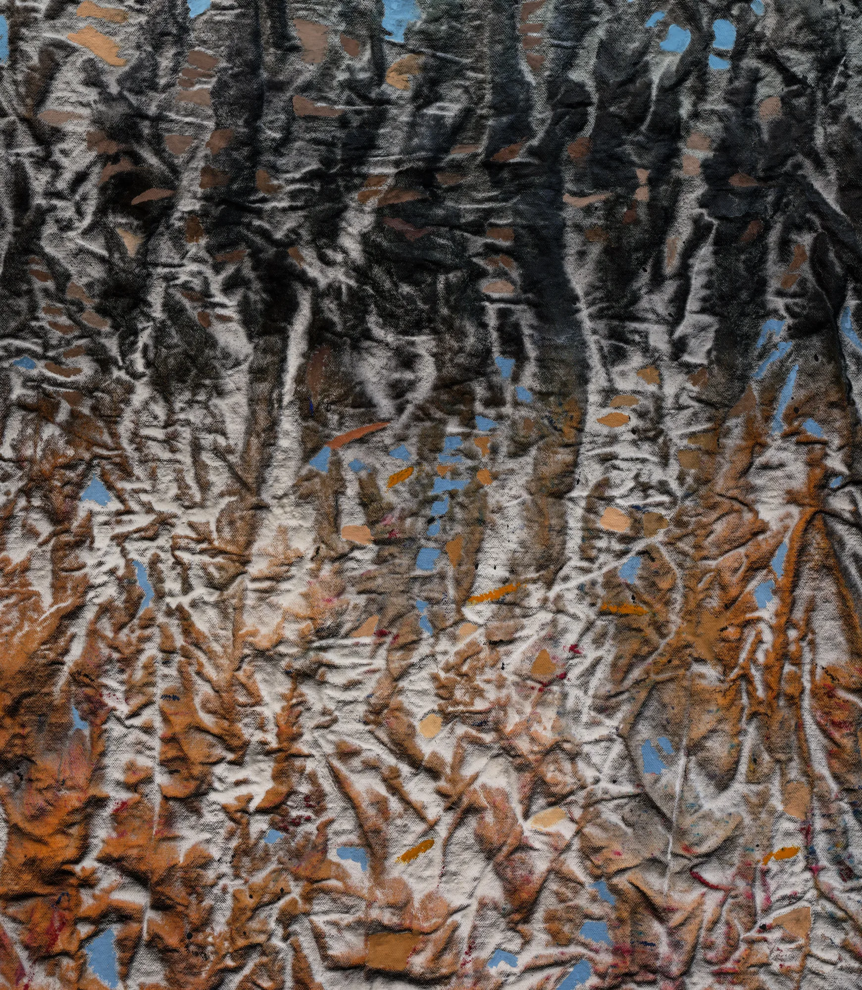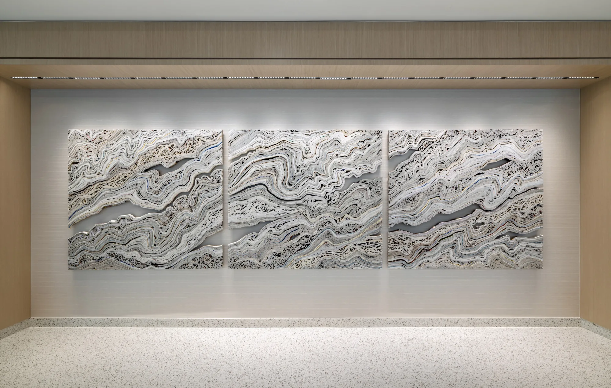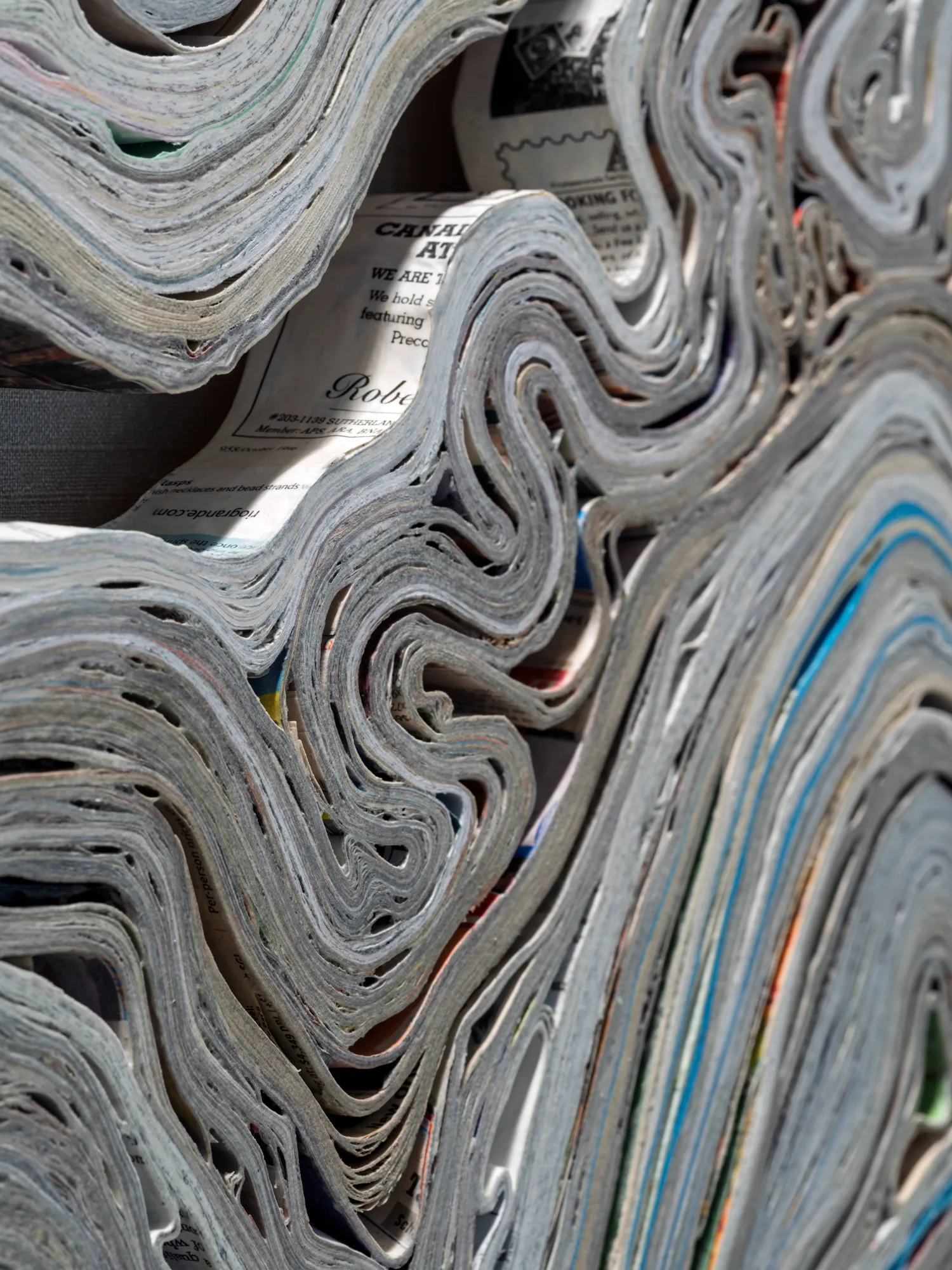 Jessica Drenk transforms everyday paper waste into layered sculptures that evoke geological formations. Made entirely from used materials such as junk mail, catalogs, and cardboard, her work highlights the contrast between the fleeting nature of human consumption and the enduring processes of the natural world. Through a process-driven exploration of material, Drenk examines how parts combine to form new textures, shapes, and meanings.
