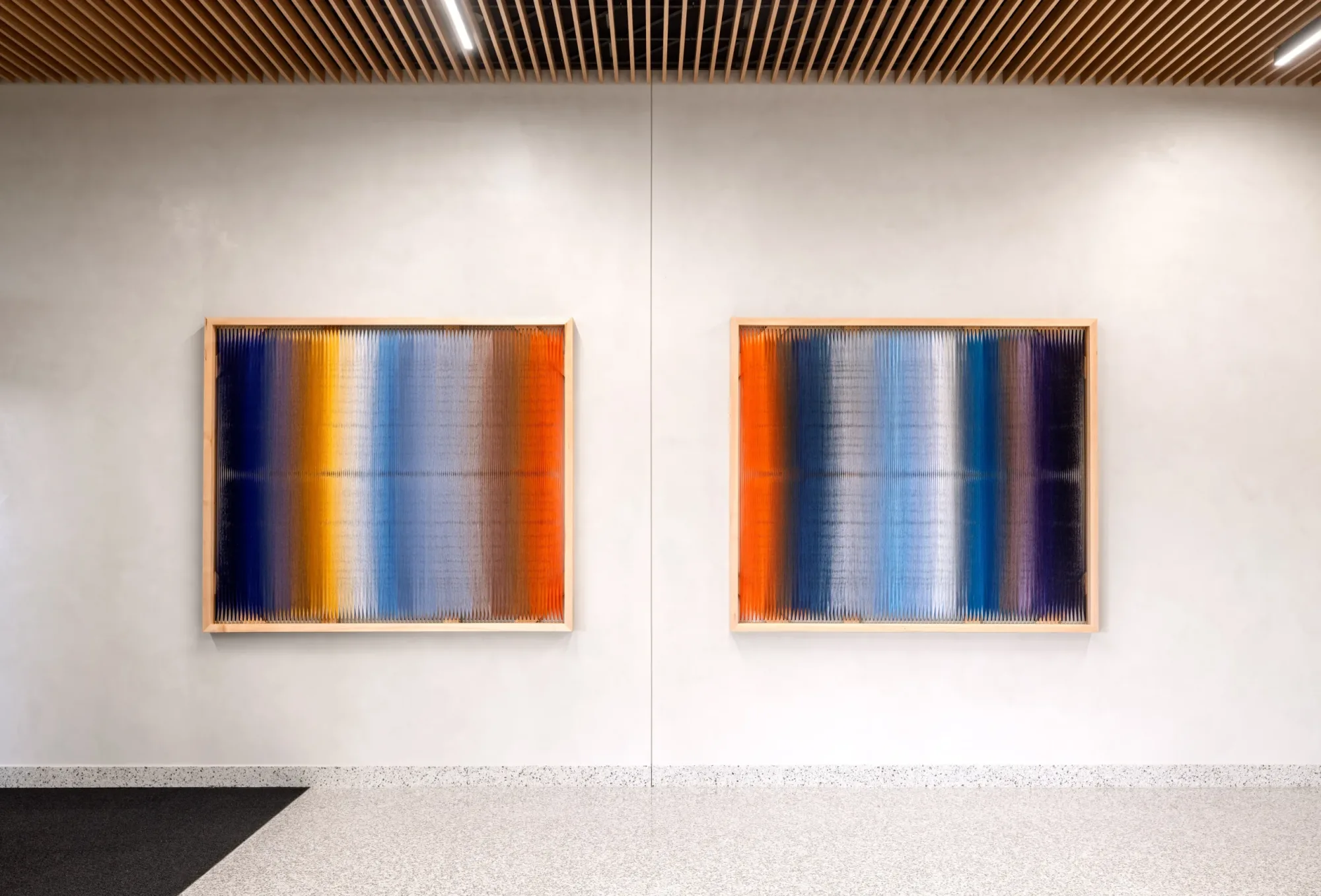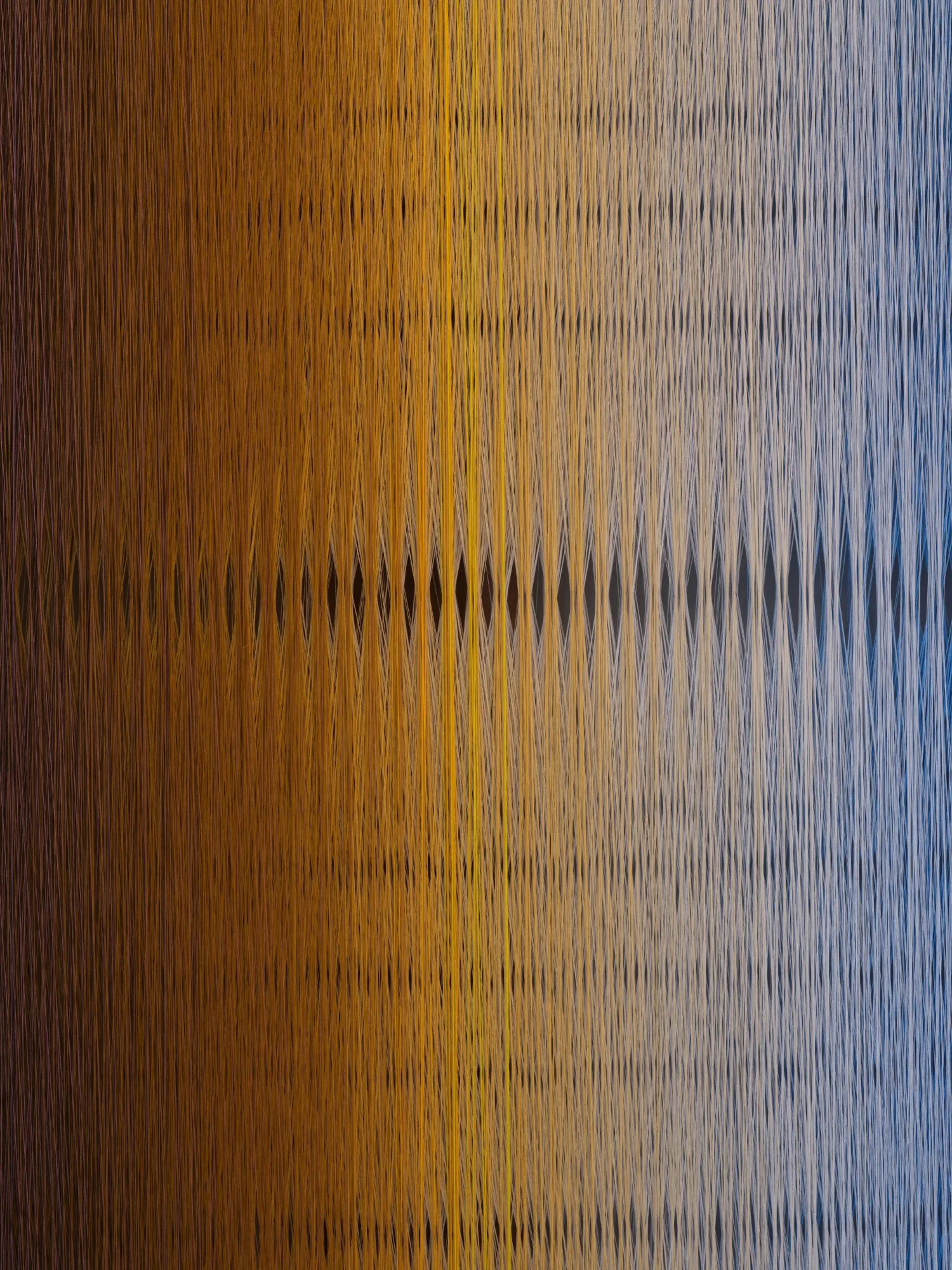RACHEL MICA WEISS, Light Wave Diptych, 2025, polyester embroidery thread, maple, brass hooks. Site-specific commission in collaboration with Carvalho.